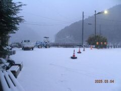 日中の気温も高めだったため、雪はかなりなスピードで融けておりました。 道路状況も心配されたのですが、夕方までには道路にはほとんど雪のない状況となっておりました。 しかし、まだ濡れているため、気温が下がると凍結も考えられ、ノーマルタイヤでの走行は危険かと思われます。