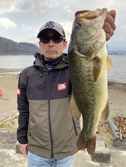 畳岩前の1mというシャローで捕ったそうで、ジャークベイトへのヒットだったとの事。 ボートから畳岩付近の岸際にキャストし、1度ジャークしたところいきなりヒット〜!!だったとの事。 やりましたネ〜! ちなみにサイトではなかったそうです。 ビッグ初バス、おめでとうございます!!