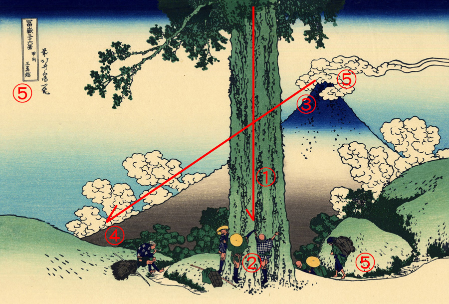 通常なら、中央の巨木の存在で視線に一定のリズムが生まれず不安定になる場合が多くなりますが、北斎の画は適度な人物配置と富士山の存在で一定のリズムを崩しません。「1」で引き付けられ「2」で溜め、「3」で引き付けられ巨木を横切って「4」で溜めが自然に入ります。つまり、インパクトのある存在感で視線を引き付け誘導し、視線の誘導先で「何をしているんだろう?」という脳の思考で視線に溜めを作っているのだと思います。私はこの緩急がこの画の魅力だと思いますがいかがでしょうか? |