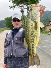 水深50cmほどの超シャローで捕ったそうで、バズベイトへのヒットだったとの事。 岸際にキャストして、早めに巻いていたらガボッと来た〜!!とのお話しでした。 良くやってくれました! お見事でした〜!!