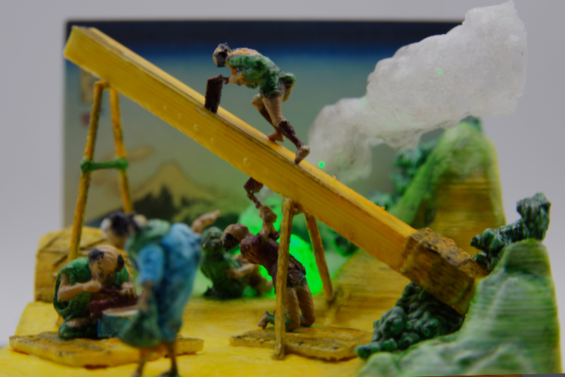 北斎・広重の作品を3Dプリンターで再現 浮世絵の立体模型を考察した位置情報を用い、現在の地形データで再現しました。 |
