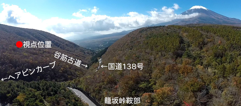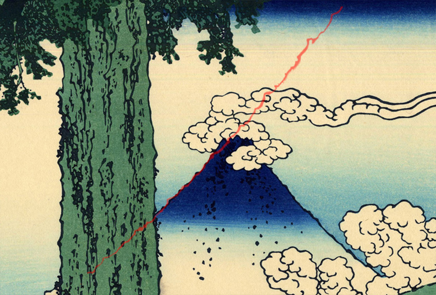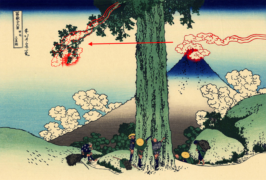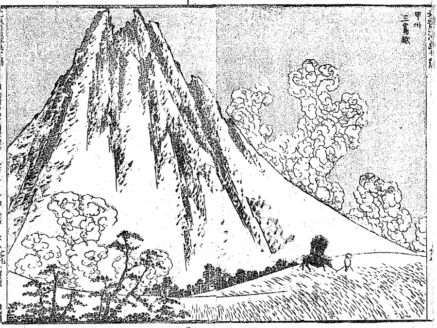 「甲州三島越」に描かれている富士山の稜線は結果的にどこの地形にも当てはまる場所がありませんでした。しかしその後、「山下白雨」の北斎の描き方は大きなヒントとなりました。ちなみに「山下白雨」の描き方は富士山の斜面から裾野にかけて広がる地形の起伏をそのまま「山下白雨」の富士山の稜線に当てはめて描いています。それと同じ手法が「甲州三島越」にも使用され、その地形が「どこかにあるはず」と思い、探し回ったわけでしたが、時間ばかりが経過し結果的に見つかるに至らなかったという訳です。 |