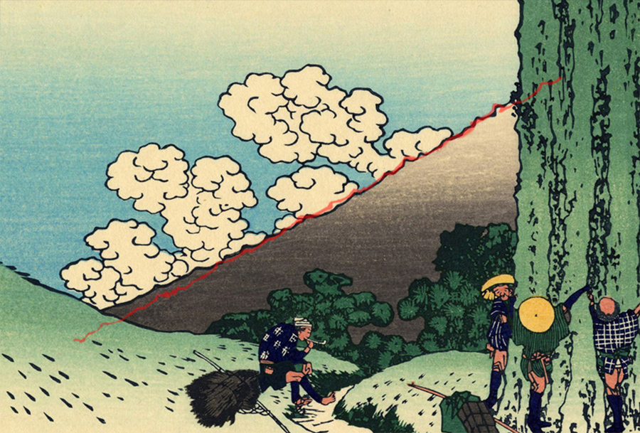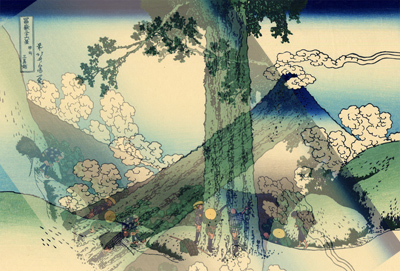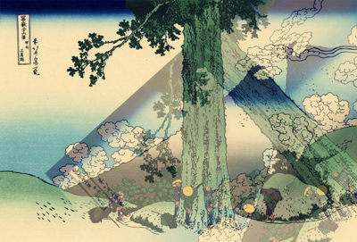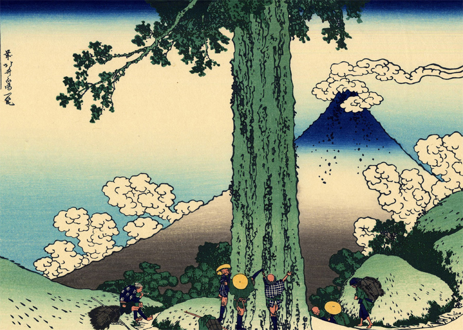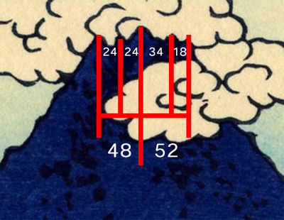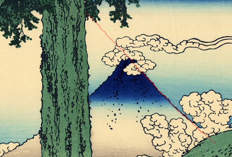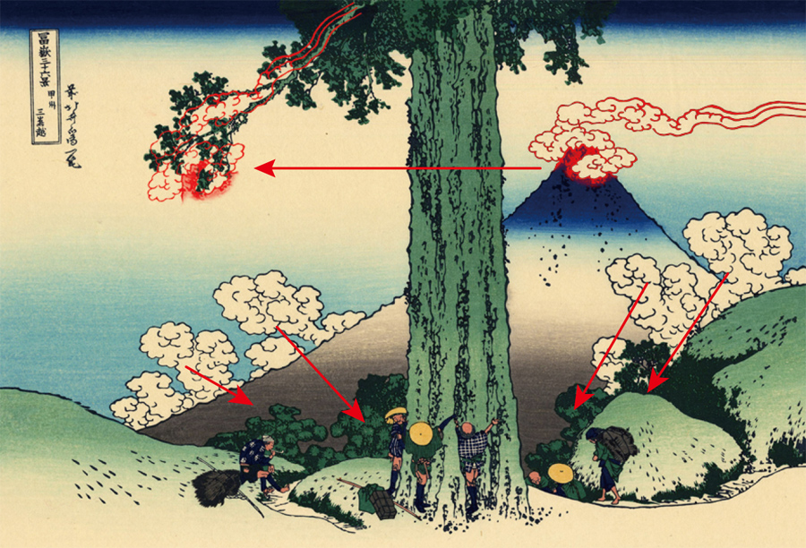 通常なら、中央の巨木の存在で視線に一定のリズムが生まれず不安定になる場合が多くなりますが、北斎の画は適度な人物配置と富士山の存在で一定のリズムを崩しません。「1」で引き付けられ「2」で溜め、「3」で引き付けられ巨木を横切って「4」で溜めが自然に入ります。つまり、インパクトのある存在感で視線を引き付け誘導し、視線の誘導先で「何をしているんだろう?」という脳の思考で視線に溜めを作っているのだと思います。私はこの緩急がこの画の魅力だと思いますがいかがでしょうか? |