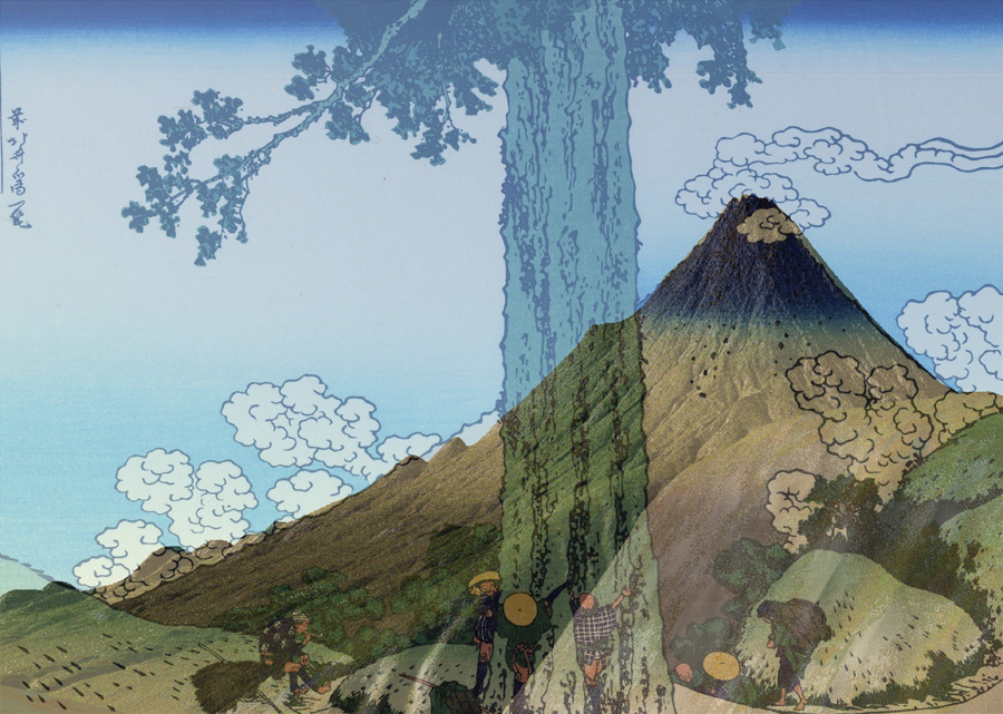 「甲州三島越」の構図を考察します。まず、中央部を分割するような巨木に「1」に目が行きます。その視線を下げてくると大人たち「2」が何かやっています。身なり持ち物から旅人でしょうか?たわいもない会話が聞こえてきそうです。そしてこのユーモラスな光景の向こうに富士山頂「3」があります。富士山のすそ野を追って「4」まで視線を移すと草履を放り投げて茅刈りを休憩している人がいます。地元の人でしょうか?旅人の驚きを自慢げに見ているようです。そして細部の「5」に視線は移り、その他のストーリーを想像させます。そしてこの峠が地元の人や旅人の行き交う要所で高低差のあるきつい峠であるにもかかわらず巨木によって一息つけるポイントへと昇華しています。