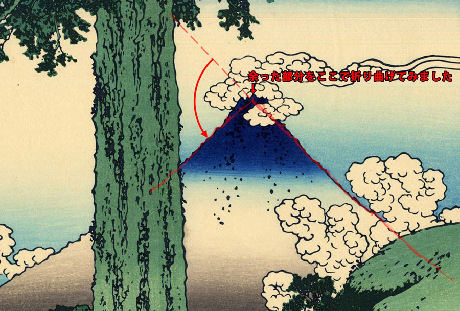 さて「甲州三島越」ですが、実際の富士山の稜線とかけ離れて描かれていることが気になります。北斎のスケッチは大変正確で「必ずどこかに同じ構図の富士山がある」と思っていますが、この画に関しては当てはまるように思えません。よって本項はひとまず視点を特定するに留めておきます。